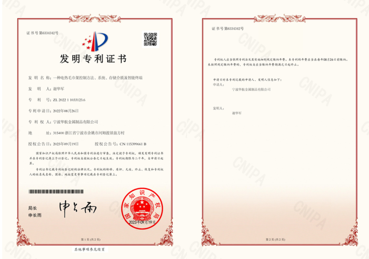 作為一家高新技術(shù)企業(yè),公司始終以“質(zhì)量求生存,創(chuàng)新促發(fā)展”為宗旨,積極開(kāi)展各項(xiàng)創(chuàng)新工作。截至目前,公司累計(jì)已申請(qǐng)并獲得國(guó)家知識(shí)產(chǎn)權(quán)局發(fā)明專(zhuān)利,實(shí)用新型專(zhuān)利及外觀設(shè)計(jì)專(zhuān)利等60余項(xiàng)。這些專(zhuān)利成果,意味著寧波華航在電熱毛巾架領(lǐng)域的創(chuàng)新成果得到認(rèn)可,為公司增強(qiáng)技術(shù)核心競(jìng)爭(zhēng)力,和公司的再發(fā)展提供了強(qiáng)有力的科技支撐